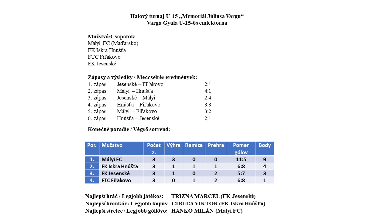 25.02.2023 sa v telocvični v Jesenskom konal už desiaty ročník halového turnaja mužstiev U-13 a U-15, „Memoriál Júliusa Vargu“.