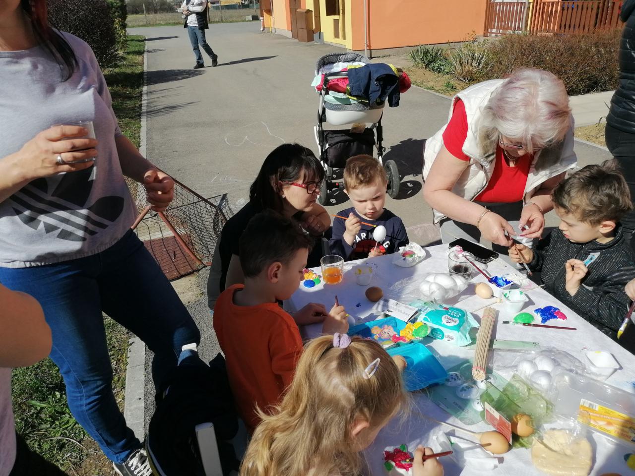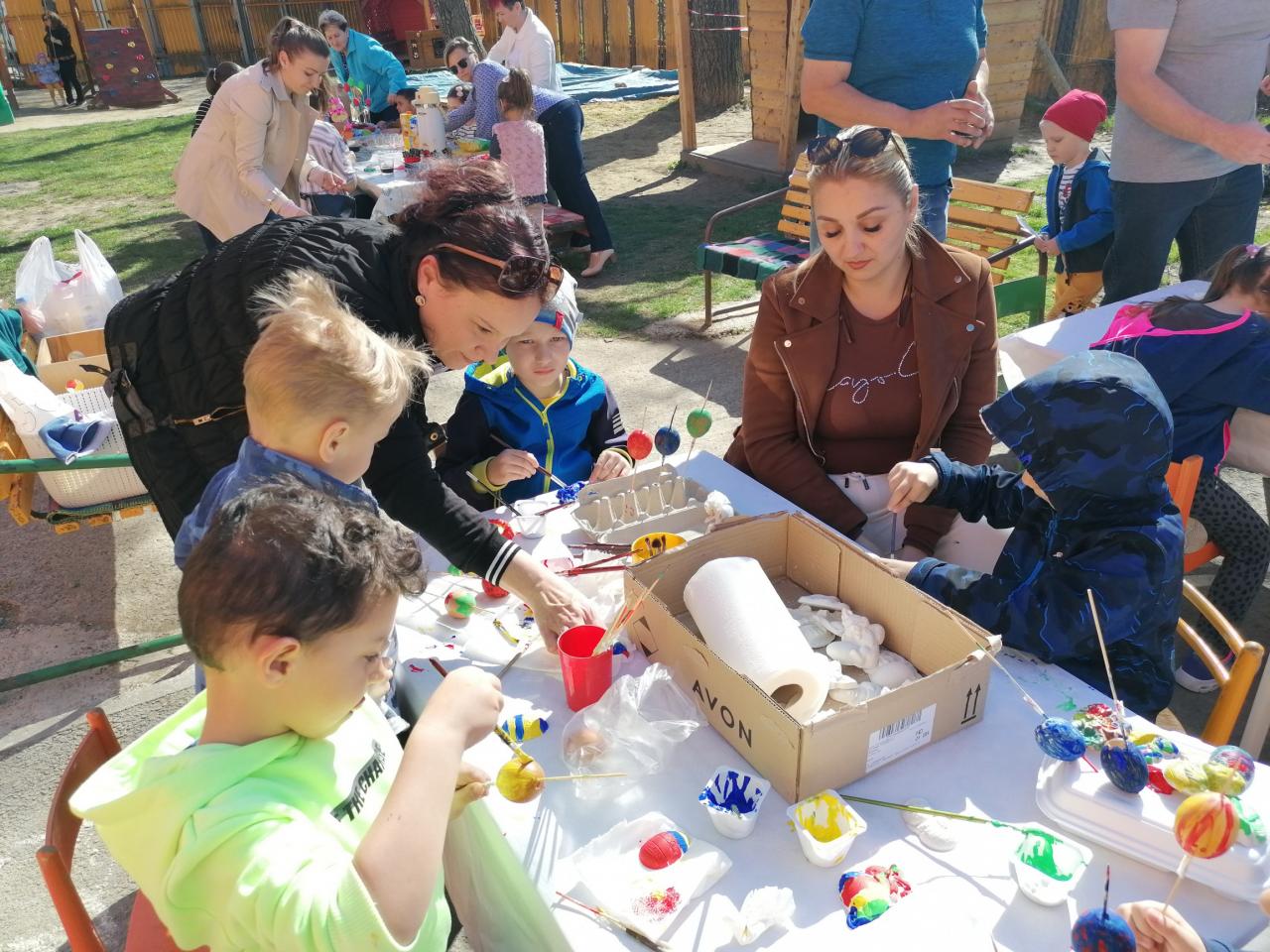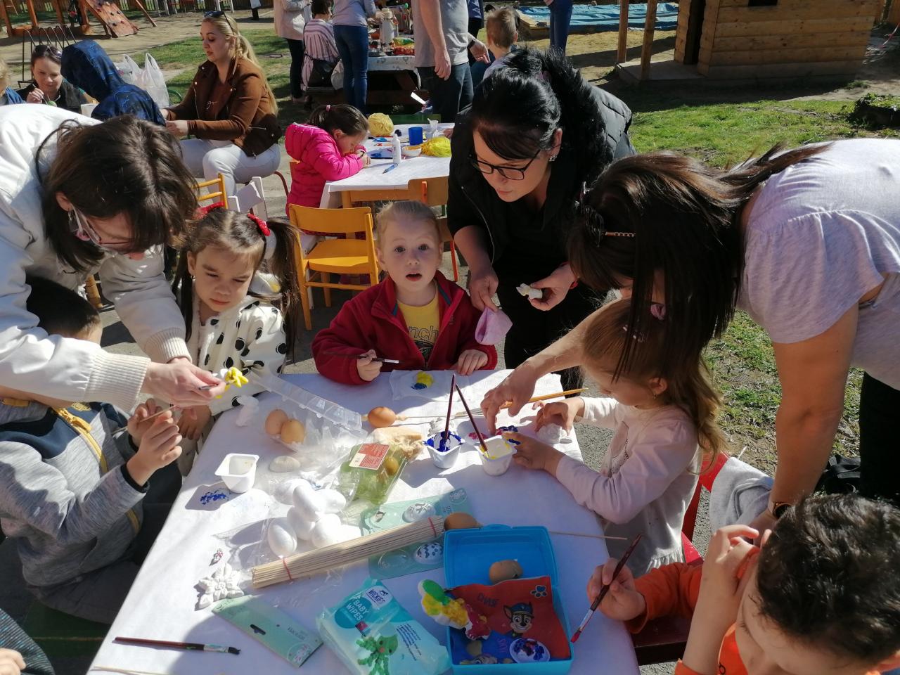 Hosszabb kihagyás után, újra lehetőségünk nyílt meghívni a szülőket egy közös húsvéti alkotó délutánra, melyet az óvoda udvarán rendeztünk meg. A Húsvét ünnepe számtalan népi szokással, hagyománnyal és jellegzetes étellel köthető össze. Napjainkban azonban az ünnep jelentőségéről megfeledkezünk, így a szépsége is kimarad az életünkből. Ezért úgy döntöttünk, visszarepülünk az időben, és a Húsvét előtti héten a gyermekekkel ezekről a szokásokról közösen, a szülőket bevonva, együtt megemlékezünk . Természetesen nem maradt el a tojás díszítés sem. Az óvoda udvara megtelt az együttlét örömével, ami mindenkiben felidézhette a Húsvéti közös készülődésének ünnepi hangulatát. Mi pedig örülünk, hogy két év után, újra egybegyűlhettünk.