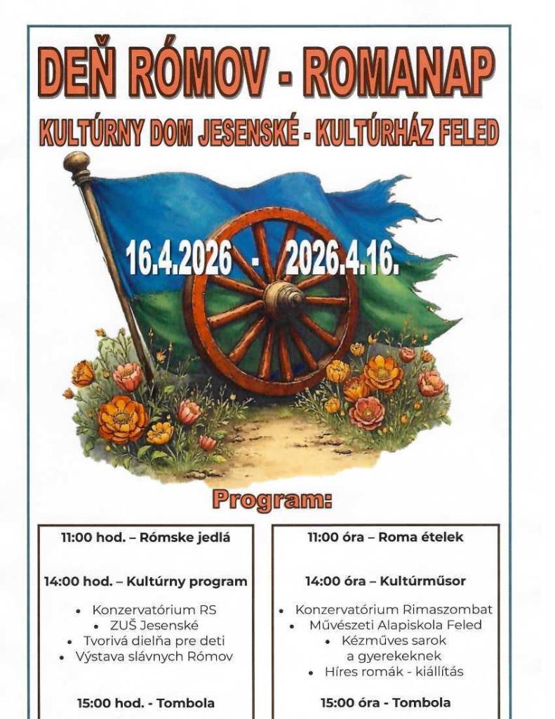 V Kultúrnom dome v Jesenskom sa vo štvrtok 16. apríla 2026 uskutoční Deň Rómov s pestrým programom pre verejnosť.