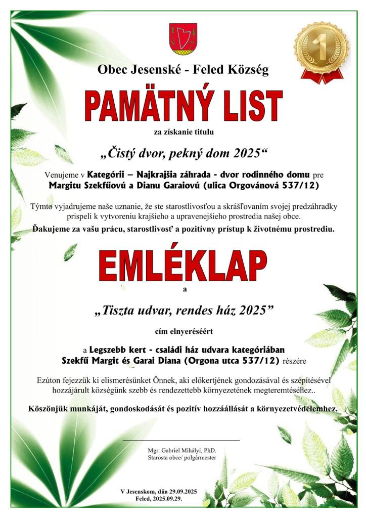 2025. szeptember 29-én a Helyi Művelődési Központ és az Információs Központ munkatársai együtt adták át a „Tiszta udvar, rendes ház 2025” címért járó emléklapokat, és megköszönték a versenyen való részvételt. Az első díjat a „Legszebb kert – családi ház udvara” kategóriában Szekfű Margit és Garai Diana nyerte, akik közösen alakították át az udvart és a ház külsejét egy csodálatos zöld növényvilággá egy kicsi halastóval a közepén. Az első díjat a „Legszebb lakóház előtti előkert” kategóriában a II. Lakóház, 2. bejárat, J. Jesenský utca 525. nyerte el, akik szintén 40,- euró értékű ajándékutalvánnyal lettek megajándékozva. Munkájukat a szeretet és a gondoskodás jellemezte, különös figyelmet fordítva az apró részletekre.