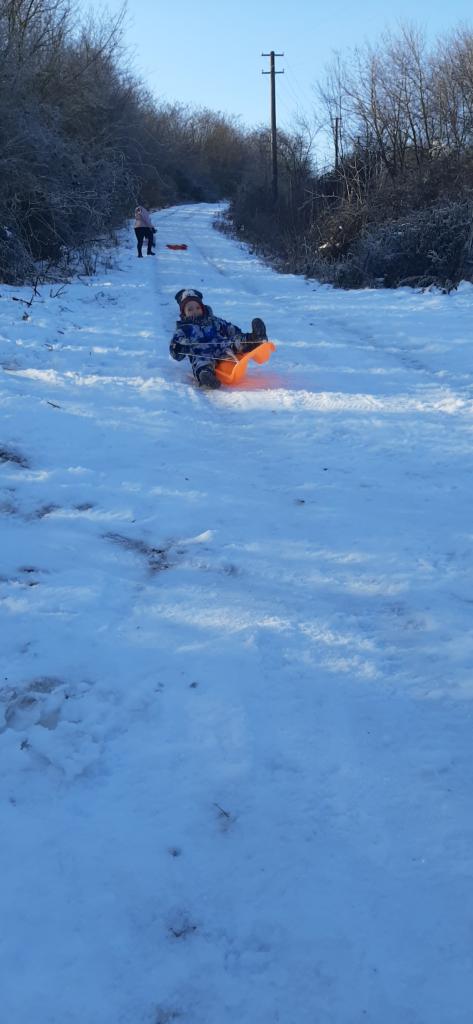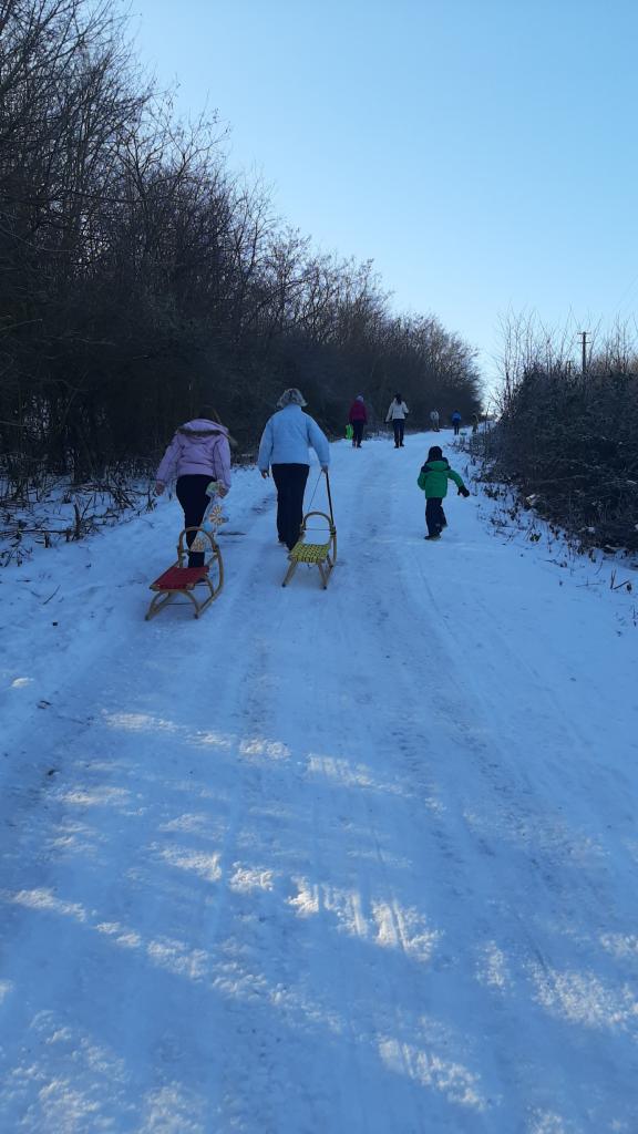 Vasárnap az Akácos a nevetés, öröm és a téli hangulat helyszínévé vált. A nap sütött, és mivel magán a dombon nem volt elég hó, a szerencsét a víztárolóhoz vezető úton próbáltuk ki, ahol kicsik és nagyok egyaránt élvezhették a szánkózást.